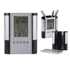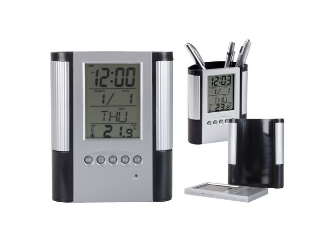 Suport pentru pixuri cu ceas, data si termometru "Loris"