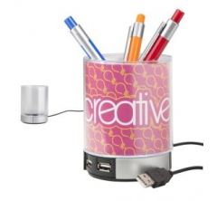 Suport "Tobi" de pixuri cu 4 iesiri pentru USB (2.0) si lumina albastra. Suportul are pereti dubli, intre care se poate insera o grafica personalizata.