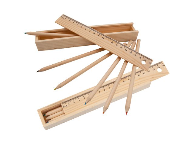 Set de 6 creioane colorate in cutie de lemn cu rigla de 20 cm.