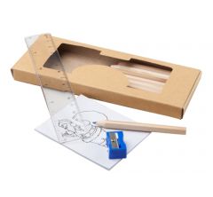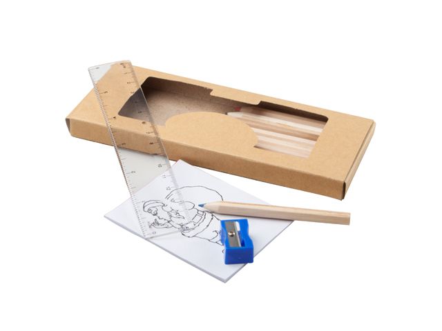 Set pentru desen compus din 12 creioane colorate, ascutitoare, rigla si carte de colorat.
