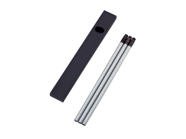 Set creioane elegant, alcatuit din 3 creioane din lemn cu radiera. Creioanele se livreaza intr-o cutie neagra de carton cadou.