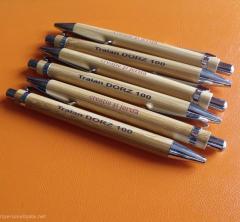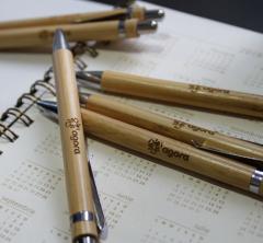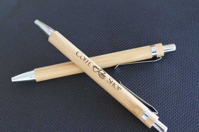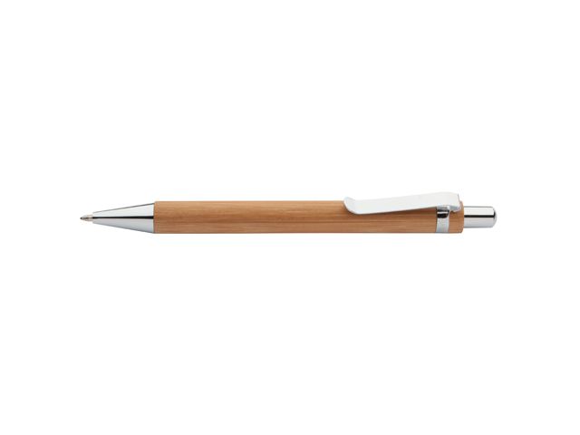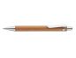 Pix din bambus cu varful, butonul si clipsul metalice. Mina pixului este albastra.