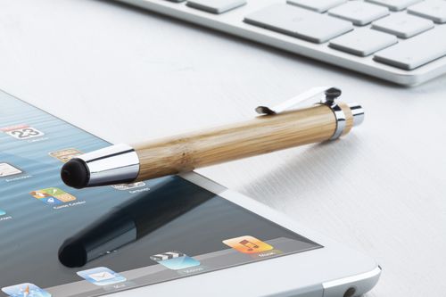 Pix "Tashania" din bambus cu insertii cromate si stylus pentru touch screen. Pixul are pasta de culoare albastra.