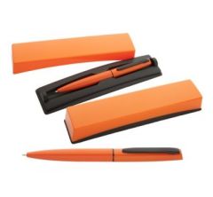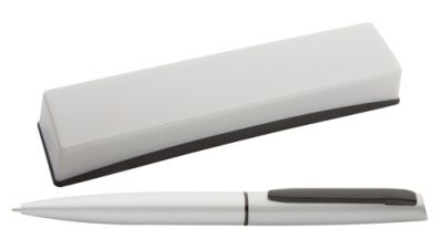Pix "Rossi" din aluminiu cu mina de culoare albastra. Pixul este intr-un suport colorat din plastic.