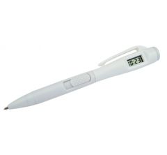 Pix alb din plastic cu ceas digital, livrat cu mina albastra si baterii incluse.