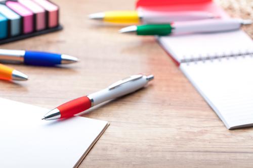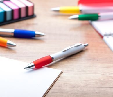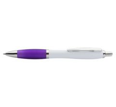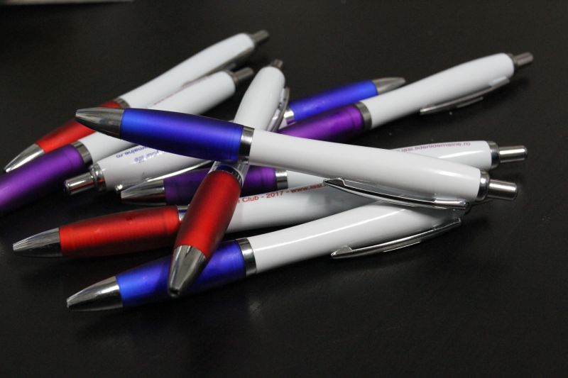 Pixuri personalizate din plastic avand corpul alb, manson cauciucat colorat si insertii metalice cromate.