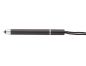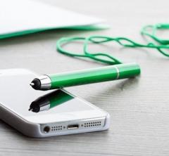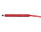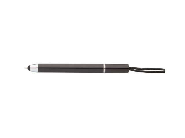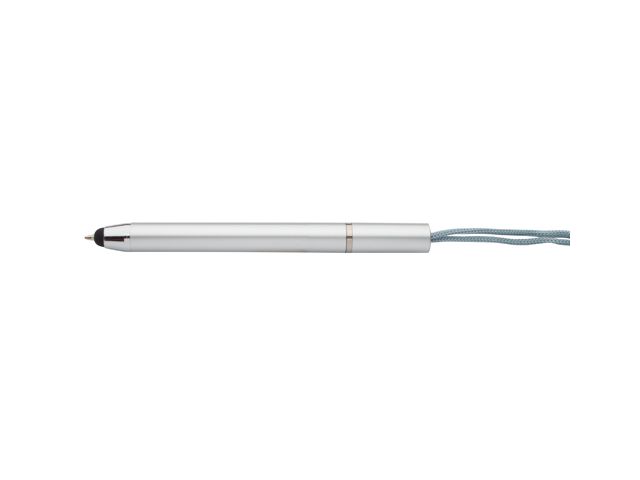 Pixuri din plastic cu insertii cromate si cu stylus pentru touch screen si lanyard in culoarea pixului. Mina este albastra.