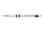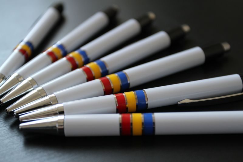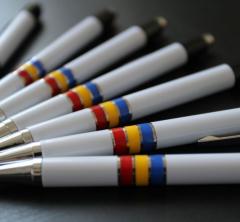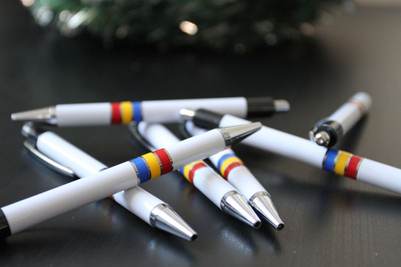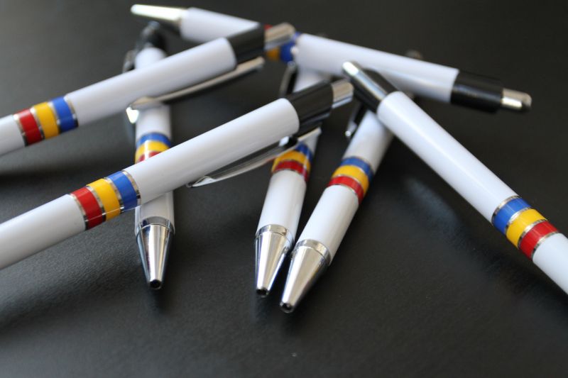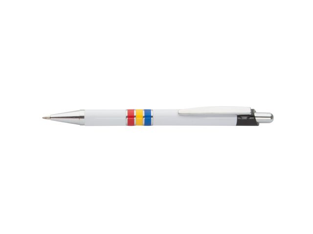 Pixuri Romania "National" din plastic, corp alb, clips si varf cromate, inele colorate in tricolorul Romaniei. Mina albastra.