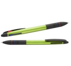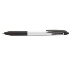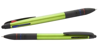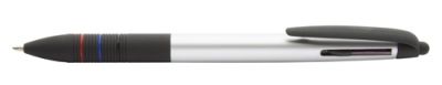 Pix "Trime" din plastic pentru touch screen cu grip cauciucat mat. Pixul are trei paste de culori diferite: rosie, albastra si neagra.