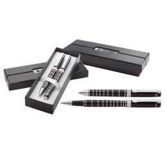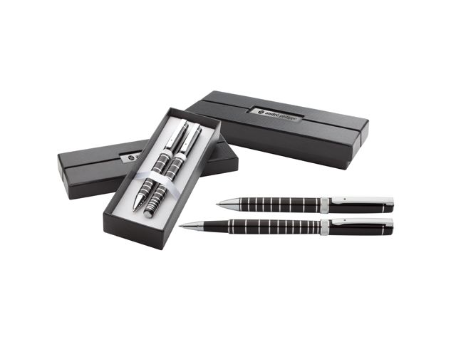 Set pix si roller din aluminiu cu model alcatuit din inele cromate. Varful si clipsul sunt si ele cromate. Mina pixurilor este de culare albastra. Setul se livreaza ambalat intr-o cutie neagra cadou cu logo-ul producatorului Andre Philippe.