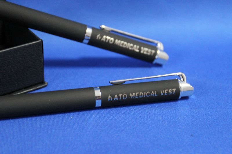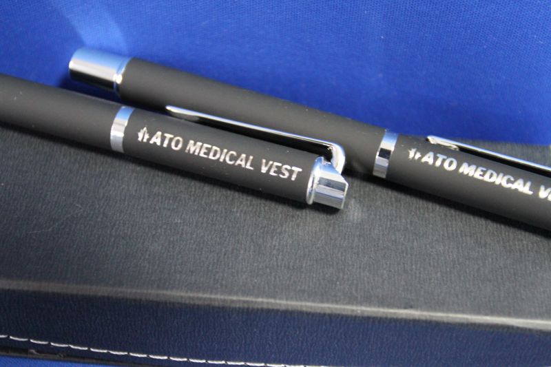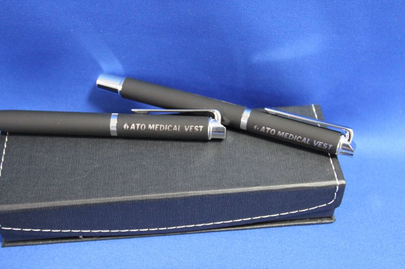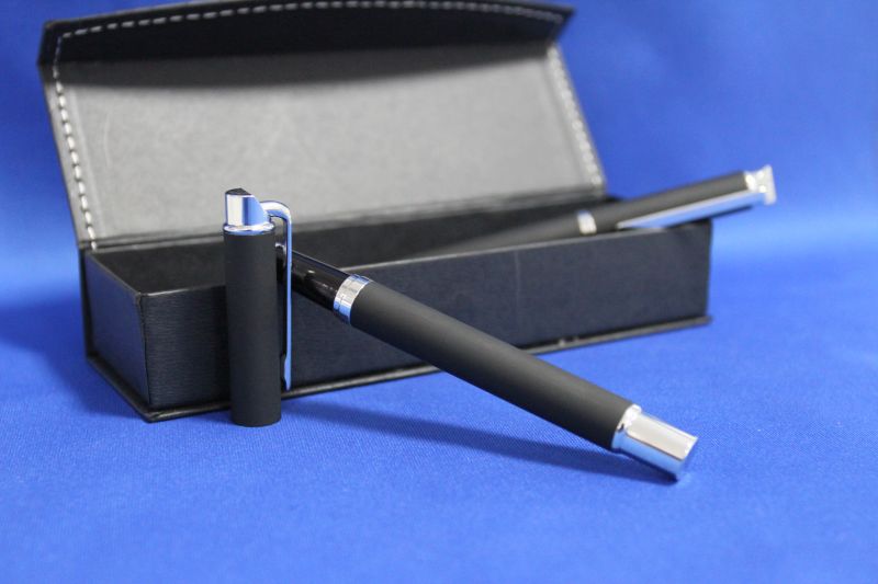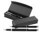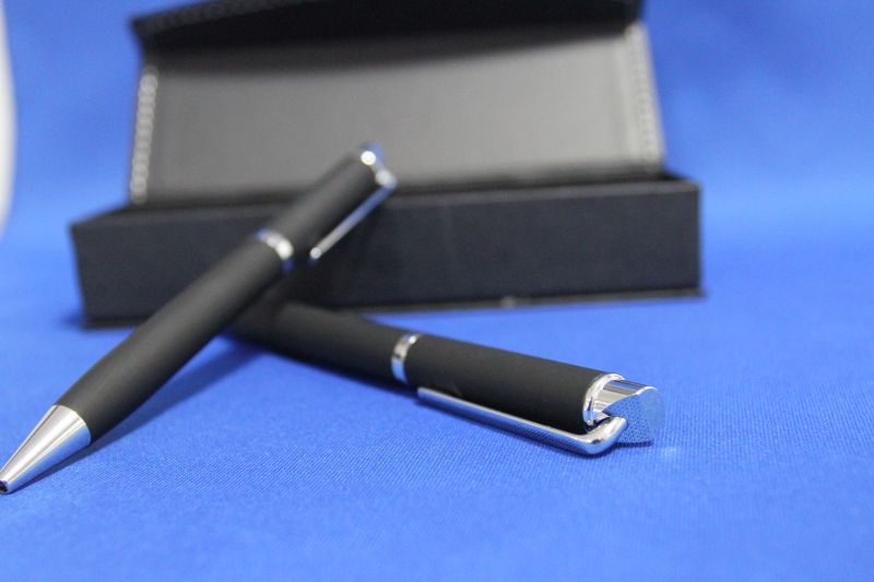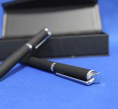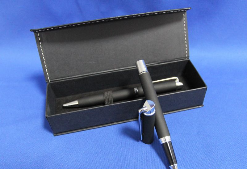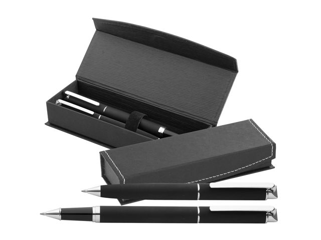 Set de pixuri in cutie cadou magnetica din hartie. Setul consta intr-un pix si un stilou, ambele metalice, cauciucate, cu pasta neagra.