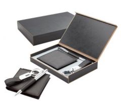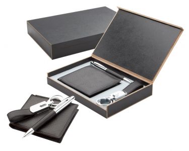Setul "Gentleman" contine un portofel elegant din inlocuitor de piele, un breloc metalic si un pix cu mina albastra. Acestea vin intr-o cutie neagra, eleganta, de cadou.