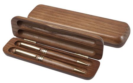 Pix si creion din lemn cu incrustatii si clips aurii in cutie din lemn.