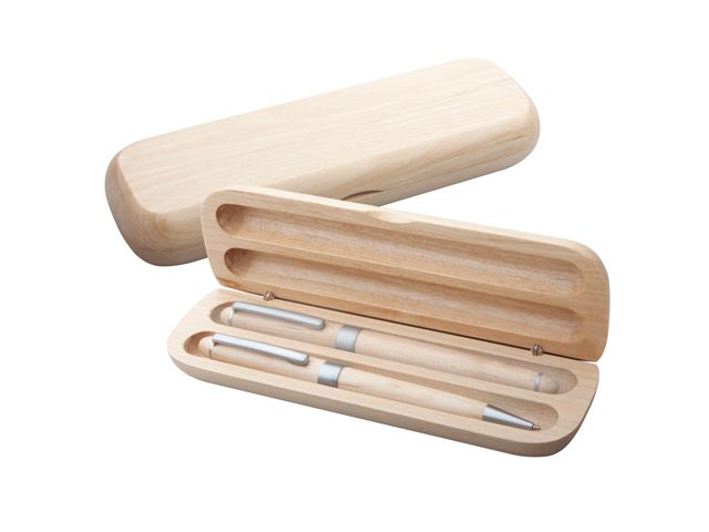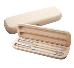 Set pix si roller din lemn natural cu varful si clipsul metalice intr-o cutie speciala suport din lemn natural. Mina pixurilor este de culoare albastra.