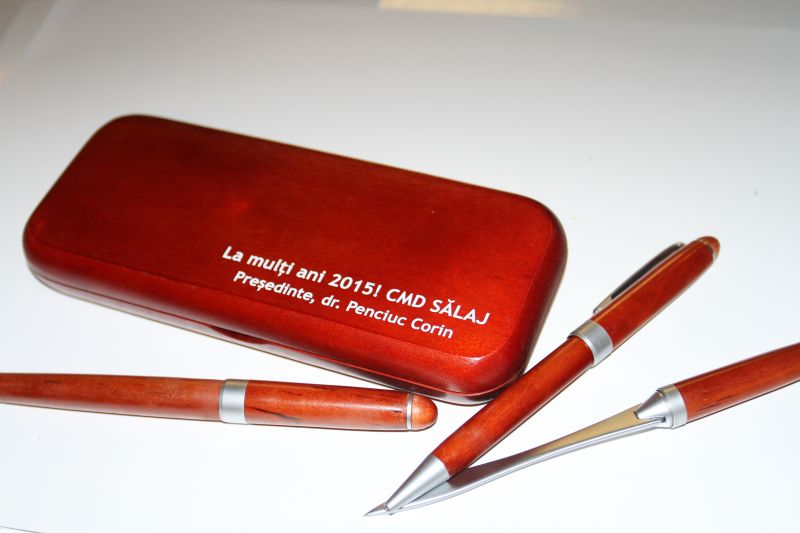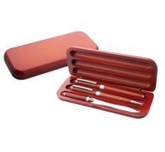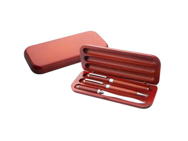Set pix si stilou din lemn natural compus din pix si stilou din lemn natural de culoare rosie si un deschizator de scrisori cu manerul din lemn. Mina pixului este de culoare albastra. Se livreaza intr-o cutie suport din acelasi lemn natural de culoare rosie.